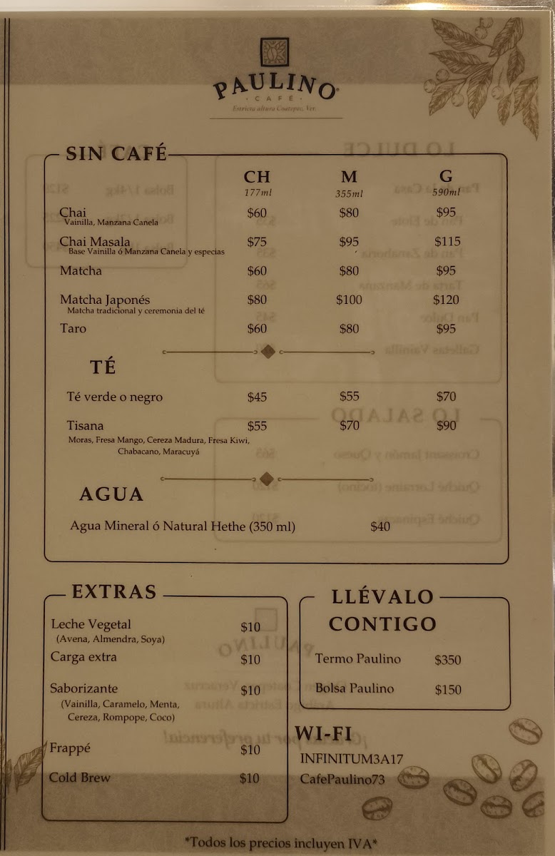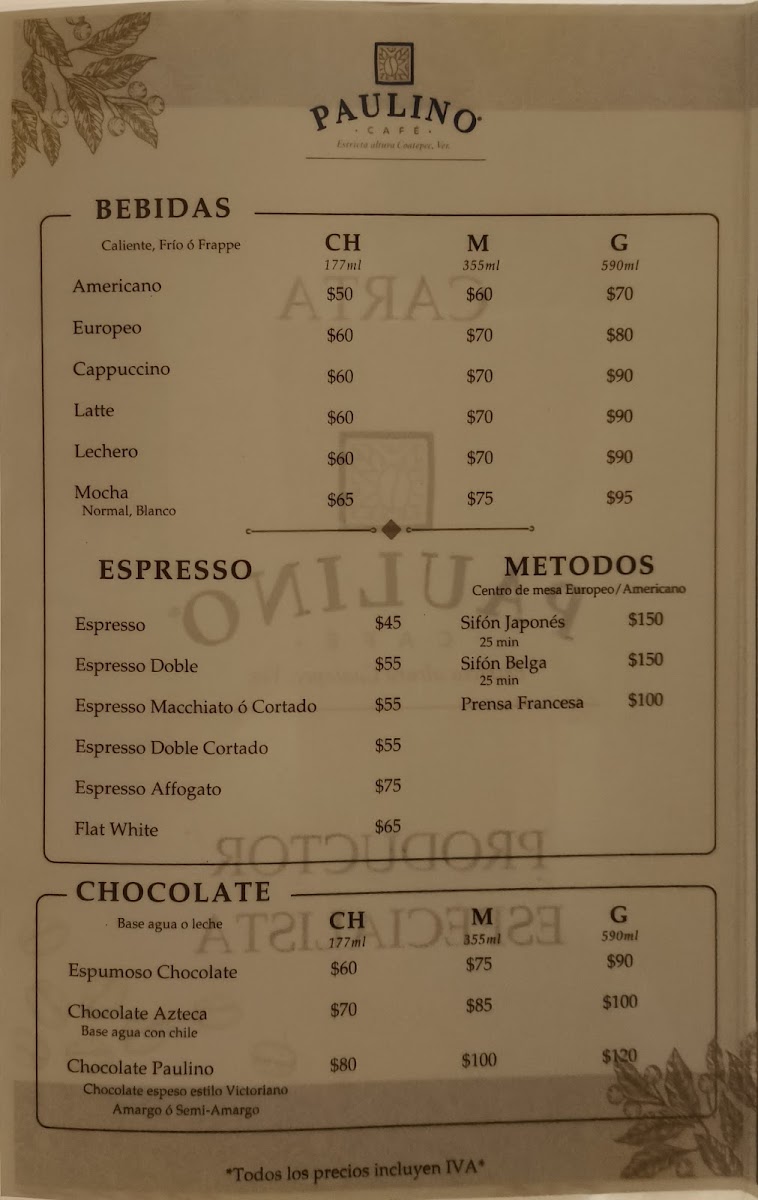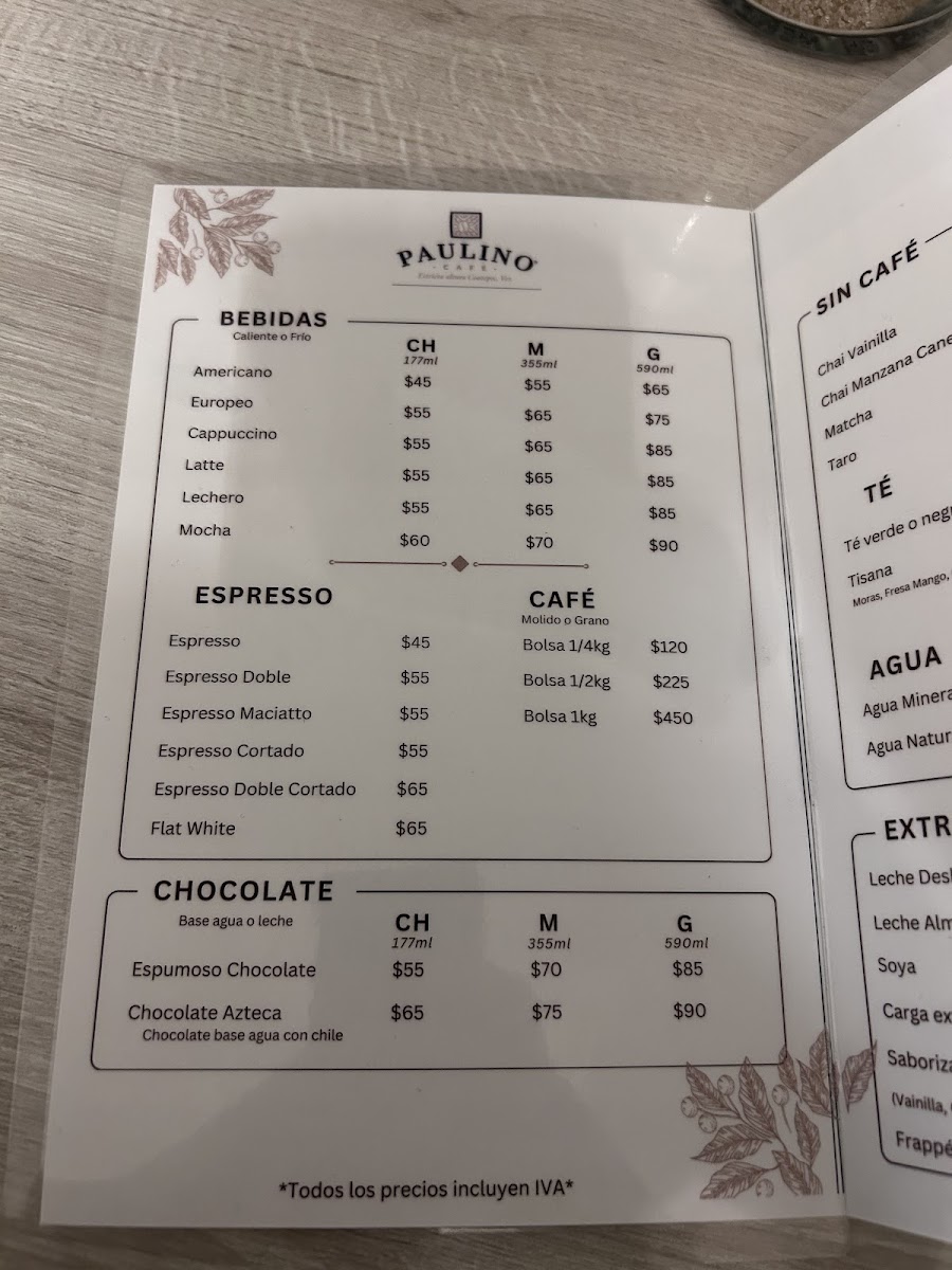 Welcome to Cafe Paulino, a charming cafe nestled in the heart of Santiago de Queretaro. This delightful spot is an ideal destination for coffee aficionados and sweet-toothed patrons alike. With a menu designed to satisfy every craving, you can indulge in classic beverages such as the rich Americano, comforting Cappuccino, or the creamy Latte—all available hot, cold, or as a frappe for just MX$50.00 to MX$65.00.